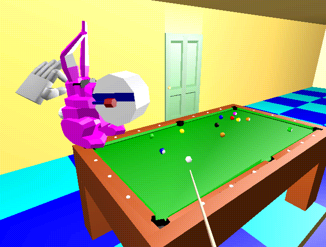 Each Alice object has a list of action routines, or callbacks, which are executed each frame of the simulation. These action routines are responsible for changing the internal state of the object (position, orientation, application-specific state, etc.) for the next animation frame. For example, in Figure 1, the action routines for each ball could compute the physics of their collisions, the bunny might beat his drum, and the cue stick might sample input devices worn by the immersed participant.